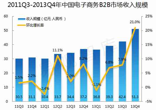 根据EnfoDesk易观智库产业数据库最新发布的《2013年第4季度中国电子商务B2B市场季度数据监测报告》数据显示,2013年第4季度中国电子商务B2B市场收入规模达51.3亿元人民币,环比增长21%。